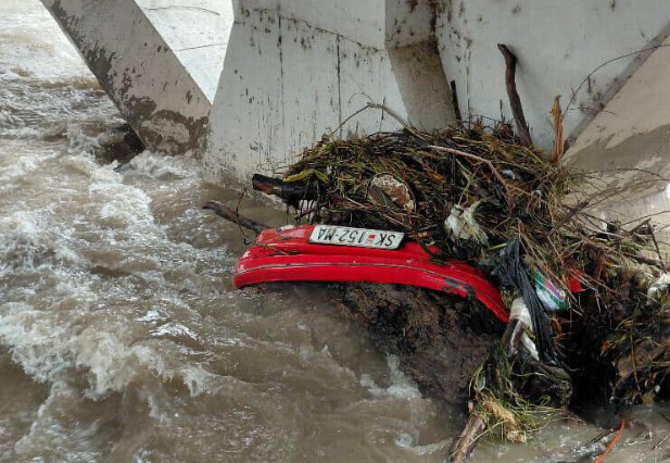 На видеото подолу можете да го забележите каросерискиот дел што заталкал и завршил заглавен под мостот, заедно со уште еден цел куп гранки и останато ѓубре кое се насобрало под столбовите на мостот.
