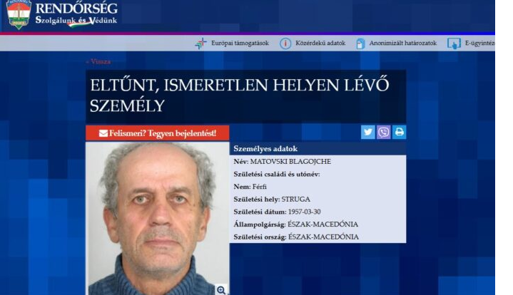 – Исчезнатиот е облечен во црна јакна и фармерки, има седа коса, речиси целосно оштетен слух и зборува само македонски, стои во објавената потрага на интернет-страницата на унгарската полиција.