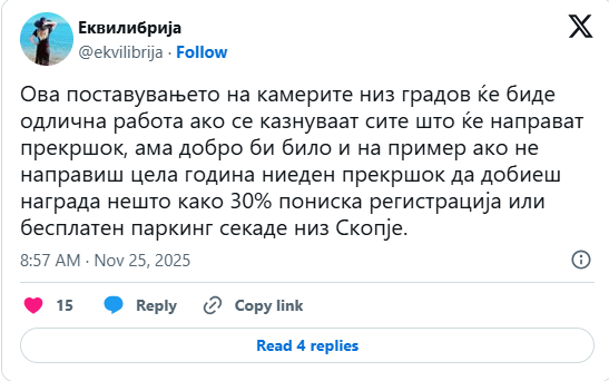 – Ова поставувањето на камерите низ градов ќе биде одлична работа ако се казнуваат сите што ќе направат прекршок, ама добро би било и на пример ако не направиш цела година ниеден прекршок да добиеш награда нешто како 30% пониска регистрација или бесплатен паркинг секаде низ Скопје.